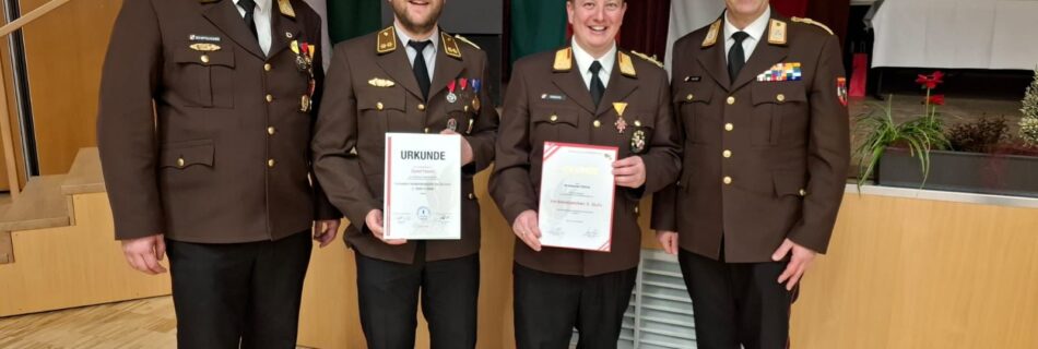 Im Rahmen der Bezirkstagung am Mittwoch, den 18. März, wurden zwei Kameraden für ihre Leistungen und ihr Engagement ausgezeichnet: Sebastian Feischl erhielt das Verdienstzeichen des Österreichischen Bundesfeuerwehrverbandes in der 3. Stufe David Feischl wurde mit der Bezirksmedaille in Silber, 2. Stufe geehrt Wir gratulieren herzlich zu diesen wohlverdienten Auszeichnungen!